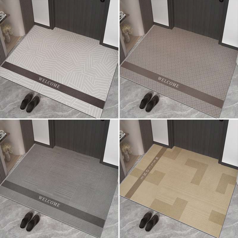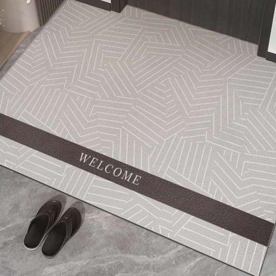 高級感のある幾何学模様と「ようこそ」の文字が印象的な室内用玄関マット。滑り止め加工で安全性も高く、洗練されたインテリアにマッチする洗練されたデザインが特徴的です。複数のパターンから選べる多様性も魅力です。