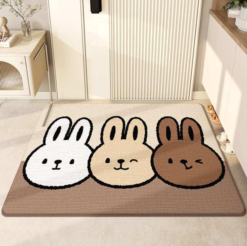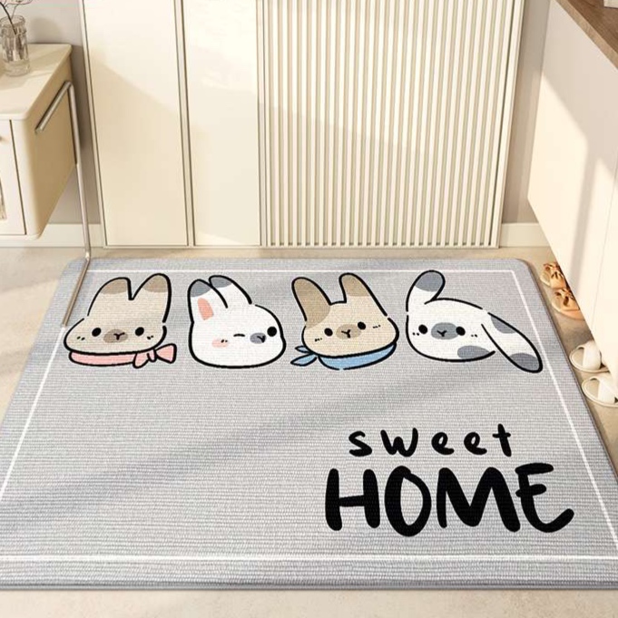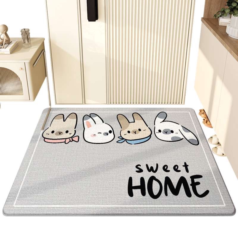 可愛らしいウサギやクマのイラストが施された屋内用玄関マット。「甘い家」のメッセージが、訪れる人々に温かい印象を与える。柔らかな色合いと愛らしいデザインは、家族やゲストを和ませ、心地よい空間を演出。玄関を彩るこのマットで、毎日の出入りがもっと楽しくなる。