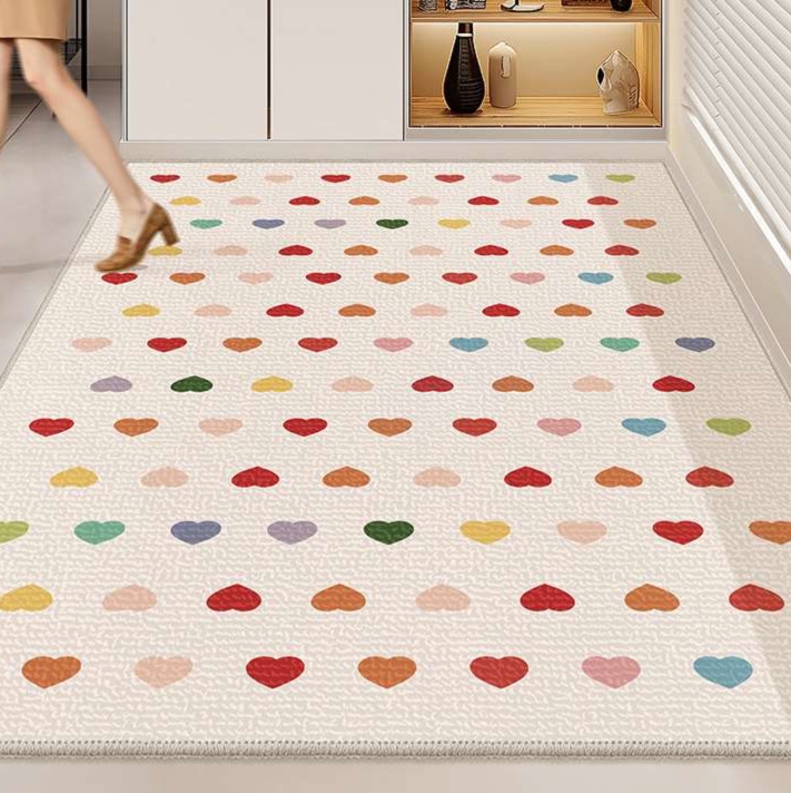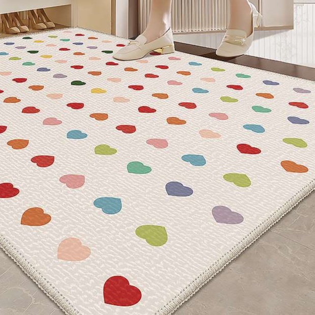 愛らしいハート模様が散りばめられた白地の屋内用玄関マット。汚れが目立ちにくく、手軽に掃除できるため、日常使いにぴったり。玄関をかわいらしく彩り、訪れる人に温かい印象を与える実用的なアイテム。おしゃれさと機能性を兼ね備えたマットで、心地よい空間を演出します。