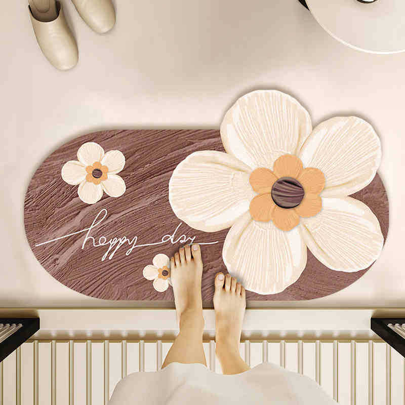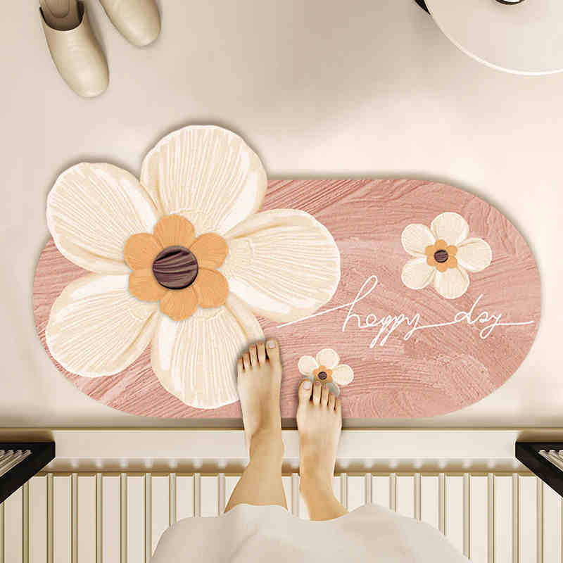 大きな花の立体的なデザインが魅力的な玄関マット 屋内用です。 楕円形の形状に大輪の花と小花をあしらい、木目調の風合いが温かみのある空間を演出します。 柔らかな素材で足触りが良く、玄関先を明るく華やかに彩ります。 滑り止め加工付きで安心してお使いいただける玄関マットです。 お客様をお迎えする玄関を優しい雰囲気に変えてくれるインテリアアイテムとしておすすめです。