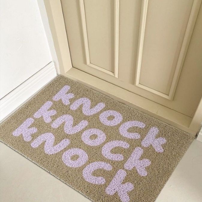 訪れる人を楽しく迎えるノックノックの文字デザインが特徴的な玄関マット 屋内用です。