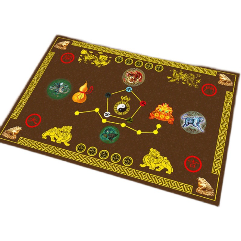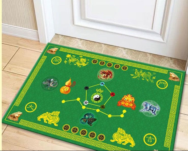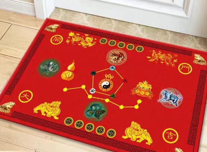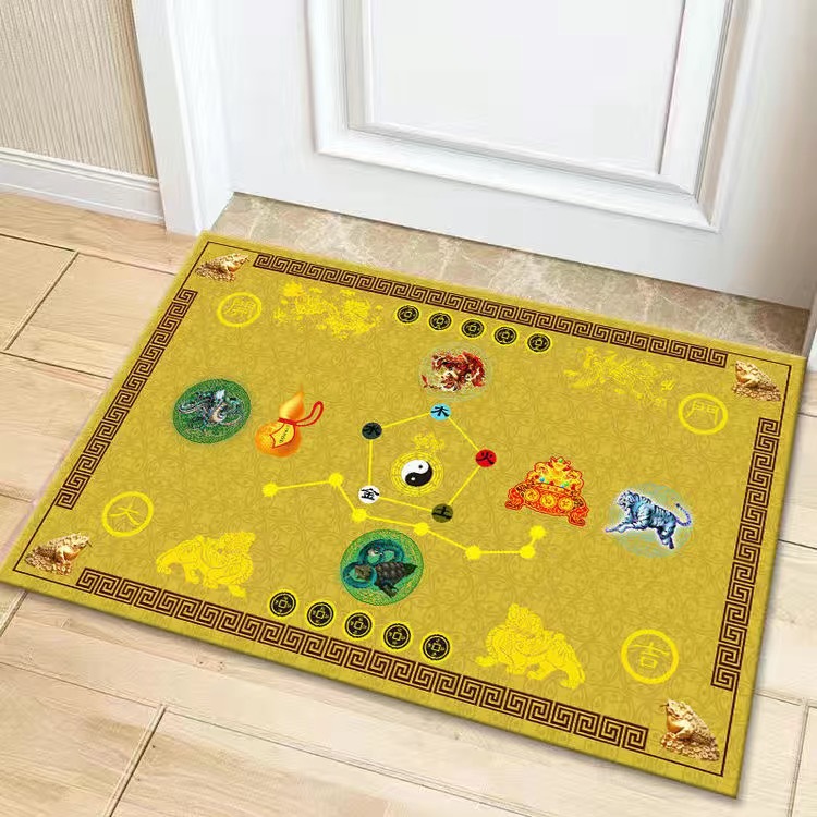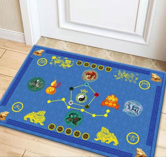 風水の八卦図と太極図を中心に、龍や虎などの縁起の良い動物、古銭などの吉祥モチーフを配した玄関マット 屋内用です。