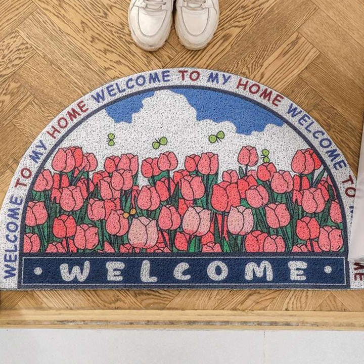 春の花々が描かれた半円形の屋内用玄関マットで、温かみのあるデザインが特徴です。柔らかな色合いが玄関を明るく彩り、訪れる人々に心地よい歓迎を提供します。耐久性に優れた素材を使用しており、手入れも簡単で長くお使いいただけるアイテムです。この玄関マットがあれば、毎日の出入りが一層楽しくなります。